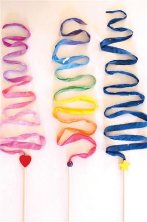 Wand 30 cm – silk streamer 275 cm (9 feet) – 5 years of age and up- available in 5 versions 1 rainbow with ball | 2 stars with star | 3 pink with heart | 5 stars | 6 desert