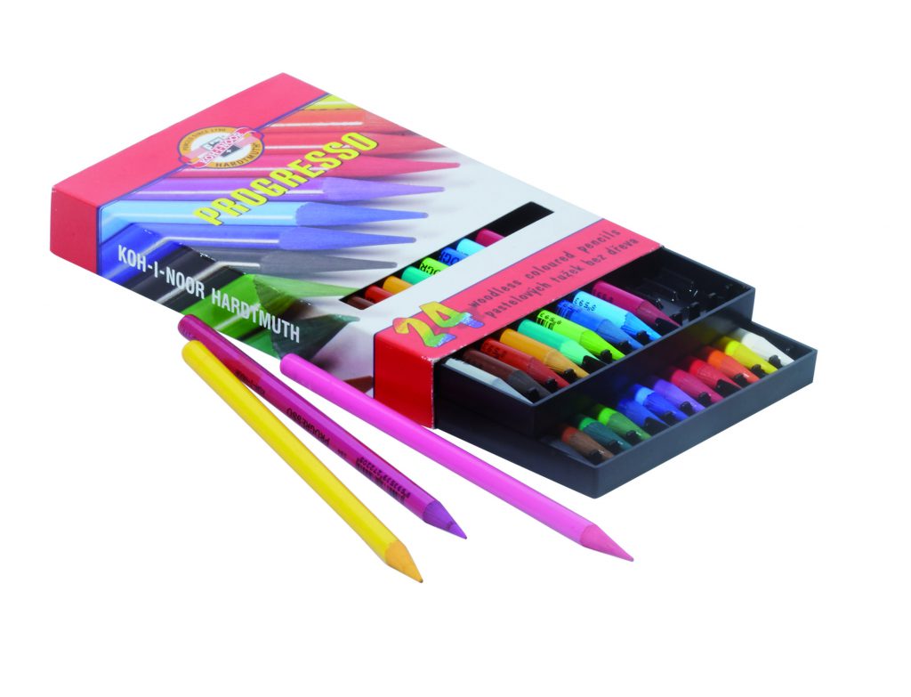 Koh-I-Noor Progresso Woodless coloured Pencils have a thin outer coating in place of a wooden body. The colour application is generous, allowing the artist to create multiple layers and to mix colours. Available in 12 or 24 assortments in a cardboard box.
