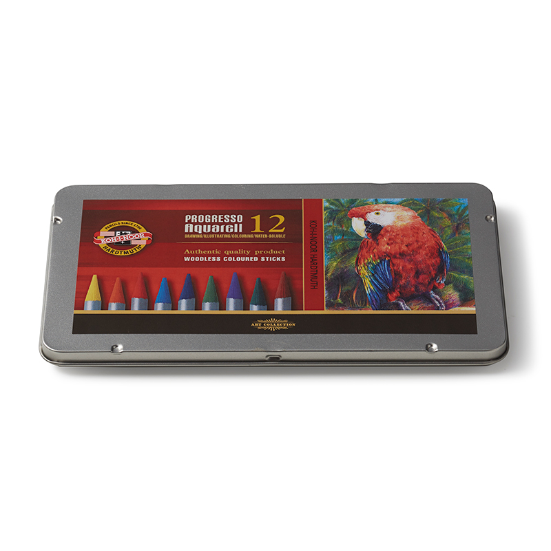 Koh-I-Noor Progresso Woodless Watercolour Pencils have a thin outer coating in place of a wooden body. The colour application is generous, allowing the artist to create multiple layers and to mix colours. The colour intensity means they work equally well when mixed with water as when used dry. Available in 12 or 24 assortments in a metal tin.