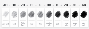 The higher the number of B, the softer the lead. Suitable for, among other things, to create shadow and depth. Graphite pencils with an average hardness (HB) is suitable for many purposes, including writing. Graphite pencils (H), the higher the number of H, the harder the lead. Suitable for, among other things, drawing lines and detailed work.