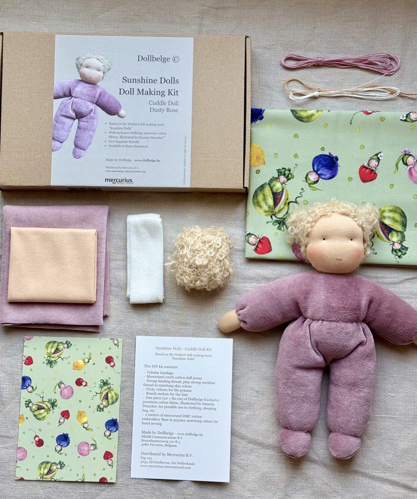 With this beautiful Dollbelge© DIY kit, you can create your own soft cuddle doll, inspired by the Waldorf doll-making tradition and based on the book Sunshine Dolls. The kit is very beginner-friendly and includes carefully selected, high-quality materials – among them the exclusive Dollbelge premium cotton fabrics illustrated by Daniela Drescher.