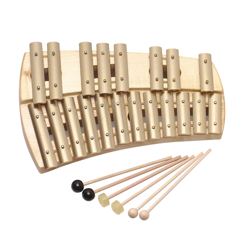 Chromatic – rounded – 20 tone. Maple wood, 20 brass plates, with 6 mallets (wood, rubber, plastic), range: c”’ – g””