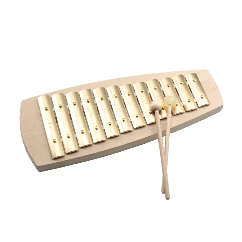 Diatonic – straight – 12 tone. Maple wood, 12 brass plates, with 2 mallets (wood+rubber), range: c”’ – g””