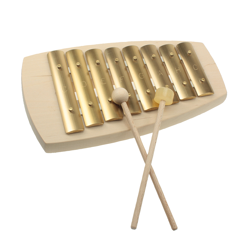 Diatonic – straight – 8 tone. Maple wood, 22.5 x 12.5 cm, 8 brass plates, with 2 mallets (wood+rubber), range: c”’ – c””.