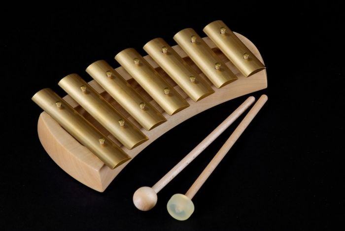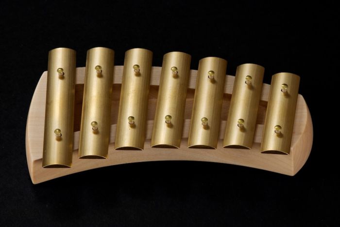 Maple wood, 7 brass plates, with 2 mallets (wood, rubber) range: d’’’ e’’’ g’’’ a’’’ b’’’ d’’’’ e’’’’ (these tones have no marking on them).