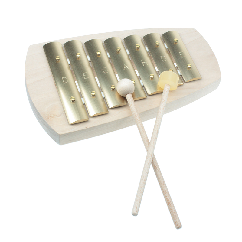 Pentatonic – straight – 7 tones. Maple wood, 21×12 cm, 7 brass plates, with 2 mallets (wood+rubber), range: d-e-g-a-b-d-e