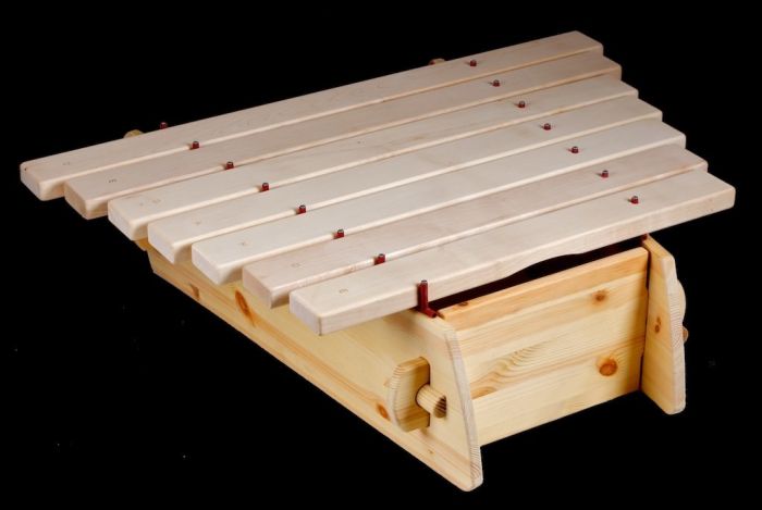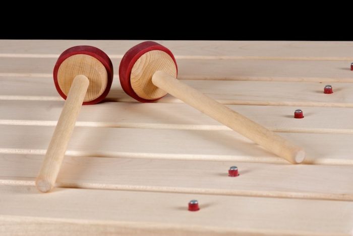 Maple wood plates, pine wood frame, 7 tones, diatonic, 2 mallets, range: d-e-g-a-h-d’-e’