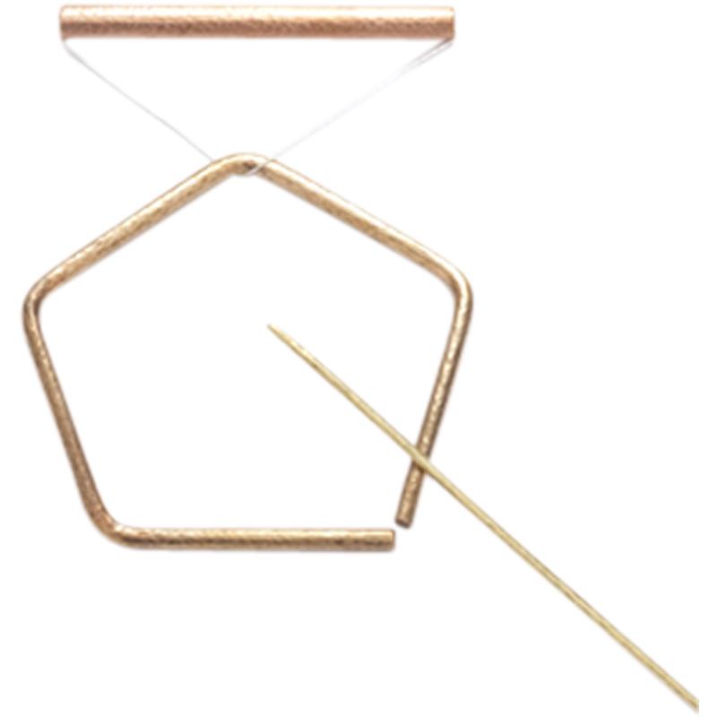 Generally, bronze has a lingering sound and a warm colourful timbre, while iron gives a shorter, stronger, elemental sound. Pentangles usually sound lighter and higher than triangles, and, the bigger the instrument, the longer and more intense, though not necessarily deeper, the tone. All triangles and pentangles come in a set with an embossed copper handle and a matching mallet.