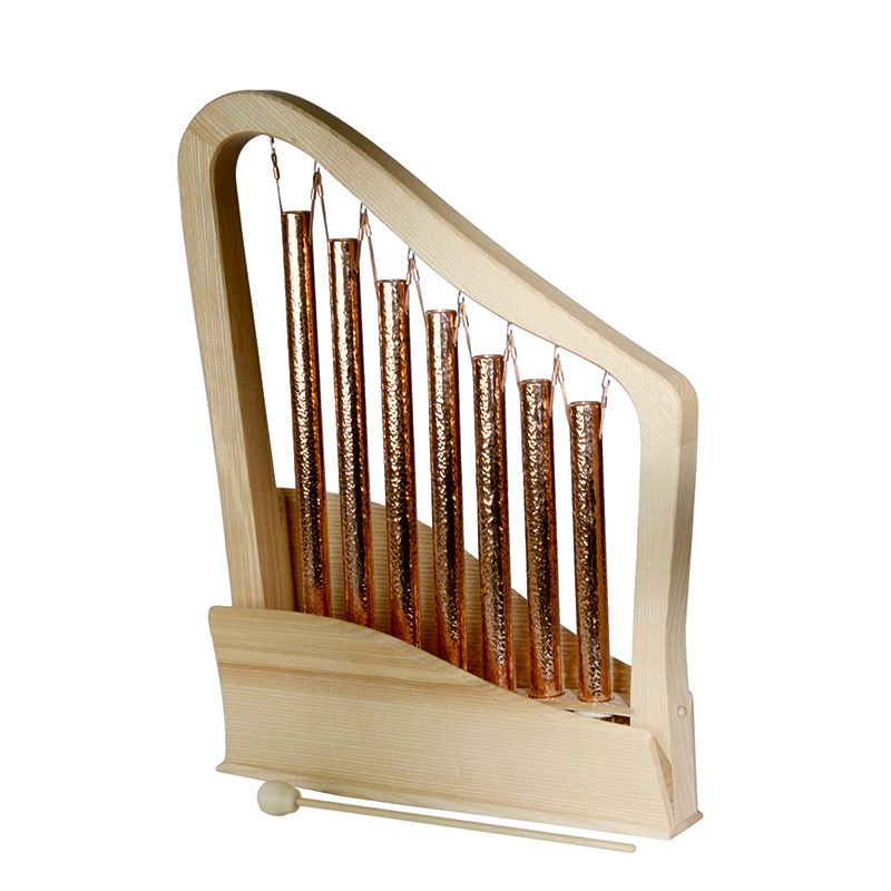Choroi Tubular Bells are chimes of copper pipes which create a vibrant bell-like tone. The sound is reinforced by the curved ash wood frame, the V-shaped resonance box, and the hammered surface of the bell pipes. Different mallets can be used to produce different timbres. To achieve a clear, bell-like sound requires a hard mallet.
