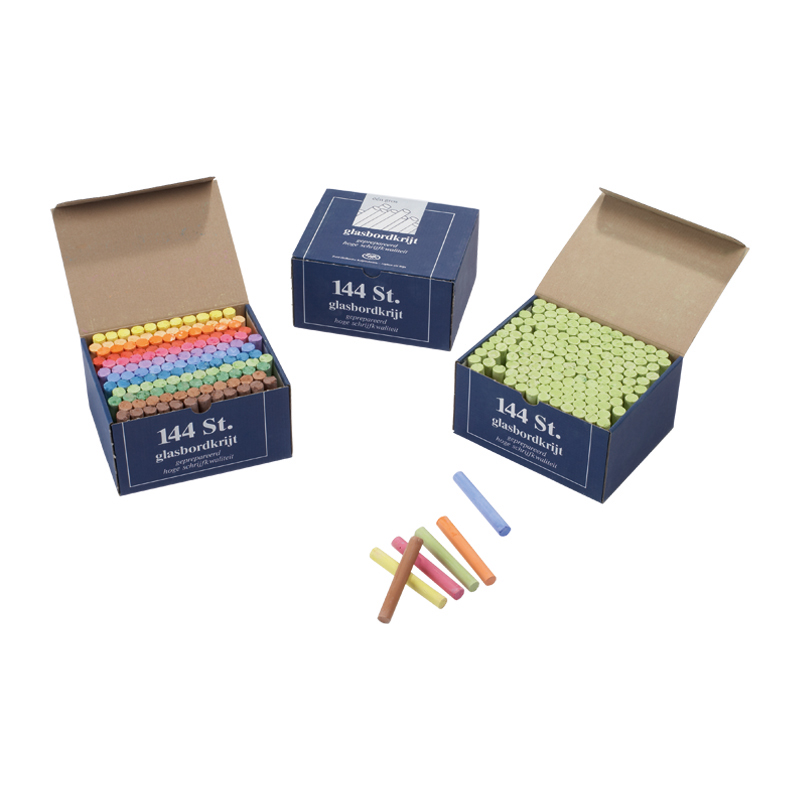 This relatively hard chalk is especially suitable for glass boards. Because of its hardness, it is easier to draw with than to paint. This round chalk comes in 12 colours. The chalk can leave a residue on certain blackboard surfaces. Single colours, 144 pieces.